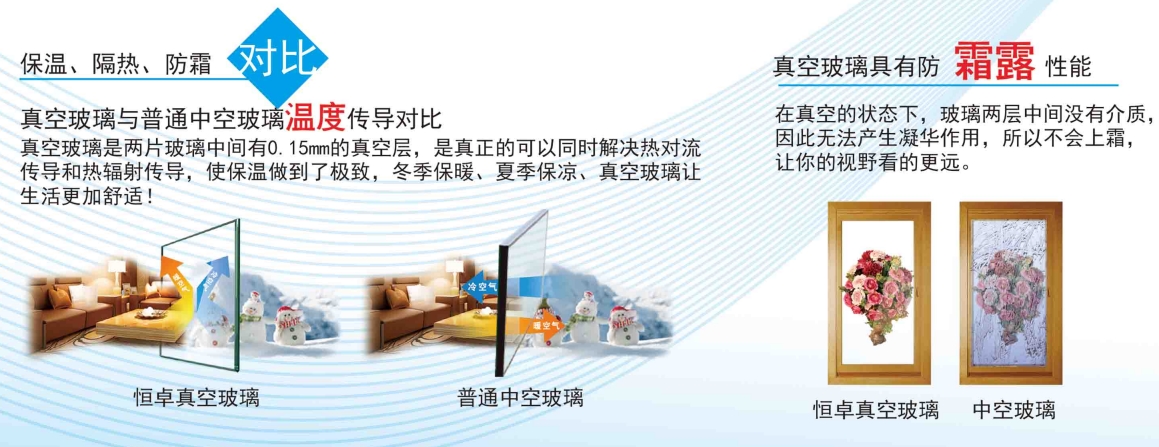 1、真空玻璃u值0. 2 (提高室內(nèi)溫度4-6度),降噪65分貝(降噪70%) ,節(jié)能80%,節(jié)能提高5倍以上,隔音提高3倍。